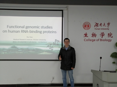 2020年12月29日上午10:30,湖北省“楚天学者”特聘教授、武汉大学医学研究院—肖锐教授,应邀来我院做学术交流,并做了关于Functional Genomic Studies on Human RNA-Binding Proteins的精彩学术报告。该讲座在黄色导航