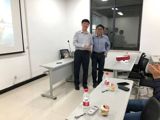 郑何平教授为王初教授颁发“天马青年沙龙”纪念杯并合影留念