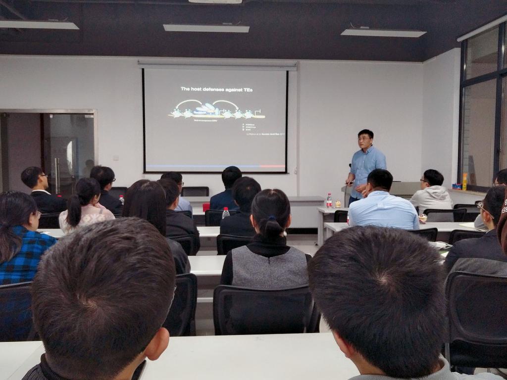 袁教授的报告新颖有趣,他首先给大家推荐了一本与生物进化相关的英文书籍《The Selfish Gene》,并以此为引子,过渡到其科研领域:DNA重复序列在真核胚胎发育和癌症表观遗传调控中的关键作用。袁教授分别介绍了PRC complex介导的H3K27me3在果蝇早期胚胎发育(细胞分裂)中的重要作用,以及结直肠癌中DNA重复序列受SWI/SNF complex调控重新激活的故事。袁凯教授的精彩报告引起了在场师生们的广泛讨论和积极提问,体现了我院蒸蒸日上的良好科研风气,最后讲座在一片掌声中结束。