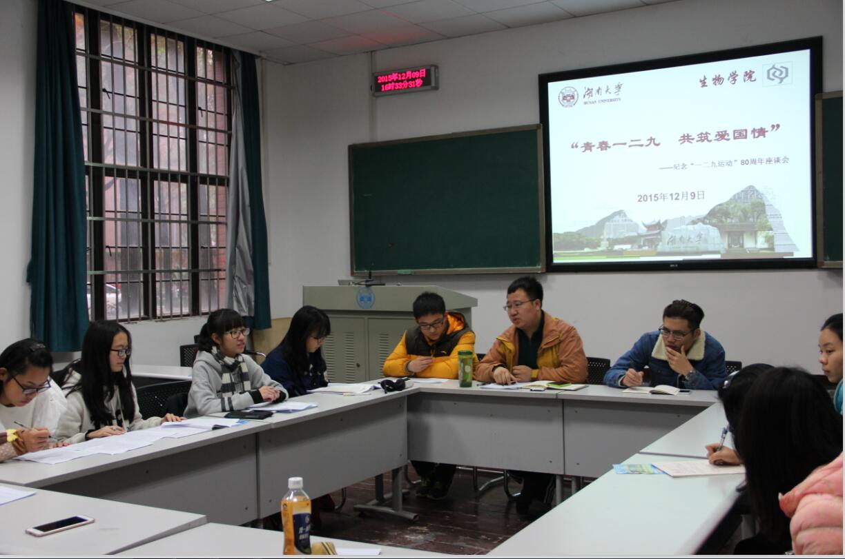 研究生会“青春“一二·九”,共筑爱国情”纪念“一二·九”运动80周年座谈会在中楼103教室举行,研究生会主要学生干部、硕士博士班班长等二十余人参加座谈会,研究生辅导员胡品老师参加座谈会并发言。座谈会由研究生会主席何壮同学主持。黄色导航