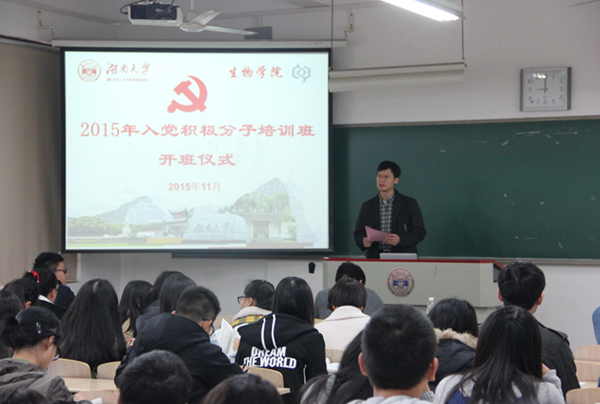 2015年入党积极分子培训班,总共有107位入党积极分子参加,其中研究生37人,本科生80人,一共分为12组,班主任由负责党建工作的辅导员胡品担任。本次培训班将邀请徐晓波书记、高耀鸿副书记、团委书记谢凤汁老师和辅导员胡品老师为大家上八次党课,内容涵盖中国共产党的光辉历程、性质、宗旨、指导思想、党员的权利与义务、中华民族伟大复兴中国梦的相关内涵等,此外还有小组讨论、分组参观实践等相关环节,高书记还介绍了培训时间、培训要求、考试考核等方面的详细情况。