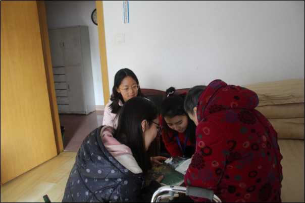 早上八点,志愿者一起乘车赴长沙市第一福利院。公交车上,志愿者集思广益,就如何与老人共享书中的精彩世界展开激烈地讨论。志愿者虽然都是第一次来敬老院,但丝毫不感到紧张,并且他们都非常愿意陪老人一起聊天、看书。其中,李运云奶奶一组的志愿者热情地给奶奶分享了《中国最美的100个地方》,更简单地为李奶奶讲述了祖国最美的风景。李奶奶认真地听志愿者为她介绍那些令人心驰神往的美景,还不时地作出回应,赞叹祖国的壮美河山。在描绘书中世界的同时,志愿者还给李奶奶唱了几首民族歌曲。伴随着美妙的歌声,迎来的是李奶奶会心的笑容。