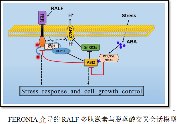 植物如何根据各种环境信号调整其生长速率是一个具有重要理论及应用价值的科学问题。各种逆境,如虫害、盐碱及干旱等都是我国粮食高产与稳产战略的不利因素。脱落酸(ABA)为植物最重要的逆境激素之一,其在虫害、干旱等多种逆境响应中发挥重要作用。最近,我院植物功能基因组学与发育调控湖南省重点实验室于峰副教授研究小组在脱落酸信号转导研究中取得重要进展:发现FERONIA介导了脱落酸与RALF小肽信号的交叉会话,并最终调节植物在逆境等环境下的生长速率。该工作以长篇论文形式(PNAS Plus)在线发表于2016年8月26日的《美国科学院院刊》(PNAS, doi:10.1073/pnas.1608449113)上。合作单位有湖南师范大学、南京大学及加州大学伯克利分校等单位。