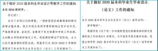 特别关注毕业班同学,组织同学填写《毕业学分核实和修课计划表》,让每一位毕业班的孩子对已修学分数、所差学分数及所差学分数的修课计划心中有数,并对有实际困难的同学落实帮扶计划。因学院绝大部分的毕业设计(论文)工作需要进行实验来完成,学院出台《做好毕业生毕业设计(论文)工作的通知》,要求导师每周若干次远程指导学生查找资料、阅读文献、设计好研究方法与技术路线等,以便返校后可以立即开展各项实验工作。