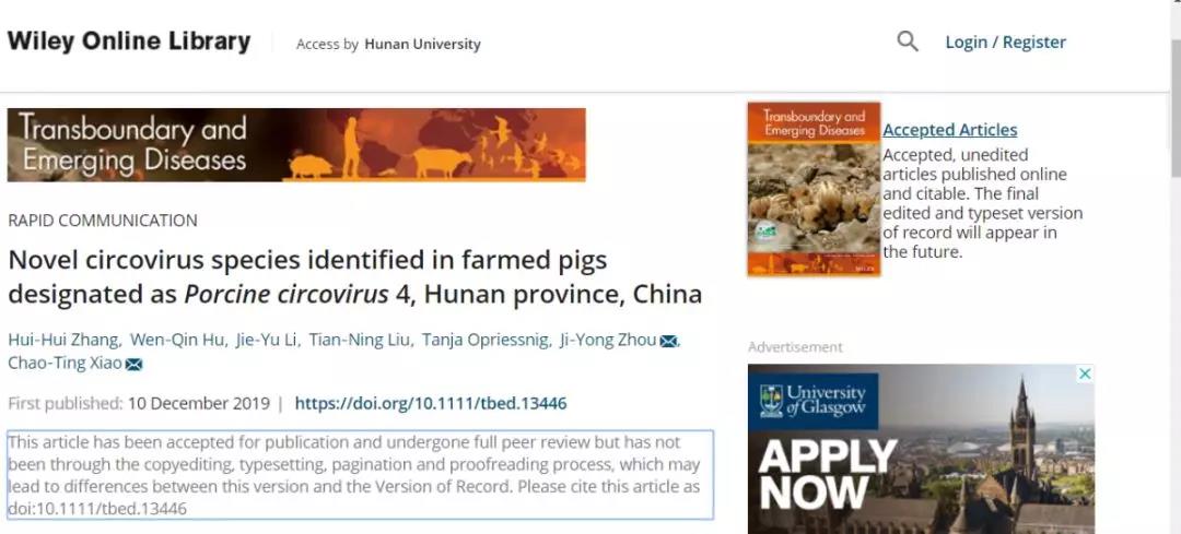 该报道指出PCV4是一个全新的圆环病毒,其基因组的大小为1770个核苷酸,它与已知引起水貂腹泻圆环病毒的基因组同源性最高(66.9%),与其他PCV基因组的同源性仅为43.2%-51.5%。该病毒的发现很快引起了国内外兽医界的高度关注。目前,该实验室正在进一步进行该病毒的复制和感染机制研究,以进一步阐明该病毒的临床意义及揭示该病毒的可能致病机制。
