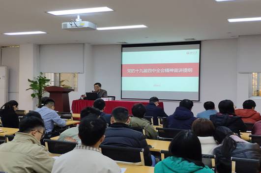 108报告厅作十九届四中全会精神专题宣讲,学院领导班子、全体党员和部分师生参加此次宣讲会。
