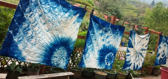 在花瑶米兰植物染坊,植物染传承人米兰阿姨亲手指导,同学们从采摘板蓝叶片和商陆成熟果实制作天然植物染料开始,经过扎图案、染色、氧化等工序,一条条图案各异的围巾、一个个时尚拉风的太阳帽呈现出来。同学们通过亲自动手操作,不仅学习了植物染手工艺,还认识了源自植物的神奇,对生命科学的专业认识也更加深入、亲切。