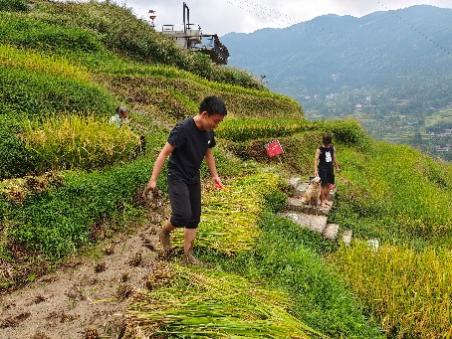在两天的生产劳动中,同学们积极参与水稻收割、植物扎染、“神仙豆腐”制作等劳动实践。金秋的梯田美如画,同学们脱掉鞋袜、挽起袖子、拾起镰刀、弯腰割禾、甩禾脱粒、装袋上田畔。看着一粒粒饱满稻谷从稻秆中脱落进入戽桶,虽然汗如雨下,但同学们的脸庞洋溢着收获的喜悦。