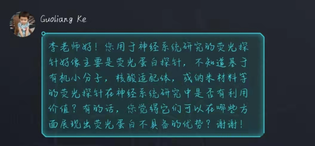 本次讲座主要围绕基于人体内大量的G蛋白偶联受体激活开发的在体荧光探针展开。首先李教授由大麻素引入,除了外源大麻素,人体本身也可以释放大麻素,为了深入研究与揭示内源性大麻素的作用机制,李教授的团队利用荧光探针对比区分出了2-AG和AEA两种内源性大麻素。接下来李教授还介绍了研究的一些应用方向,比如小鼠对大麻素的反应有与人类似的地方,可以通过癫痫小鼠受刺激时的大麻素释放情况,来研究治疗人的癫痫。并且经过一系列的实验,李教授和他的团队研制出的大麻素探针具有很好的时空分辨率。