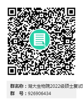 达到复试分数线且有意愿参加我院复试的考生请加入“湖大生物院2022级硕士复试群”(简称“复试QQ群”),群号:926906434,相关通知将在群内发布,请务必加入!不参加本院复试的考生勿扰。