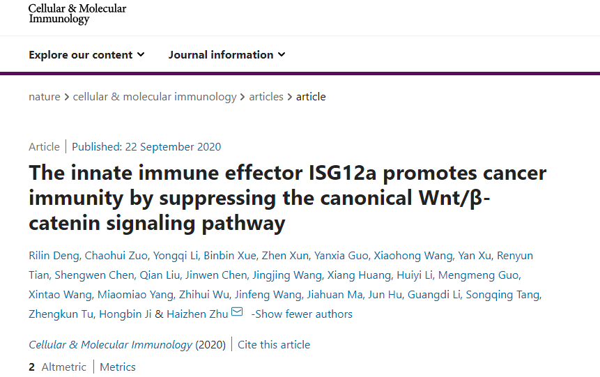 、医学病毒学湖南省重点实验室、化学生物传感与计量学国家重点实验室朱海珍教授课题组联合湖南省肿瘤医院、吉林大学第一医院、中南大学公共卫生学院、中科院上海生物化学与细胞生物学研究所多中心合作发表的题为 “The innate immune effector ISG12a promotes cancer immunity by suppressing the canonical Wnt/β-catenin signaling pathway” 的研究性论文 [1],该论文的第一作者为黄色导航