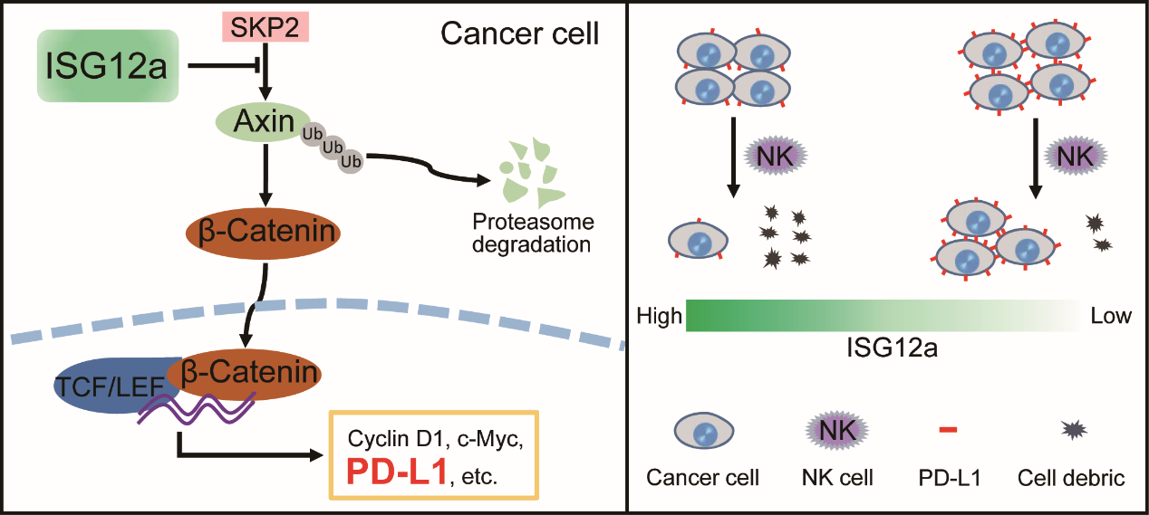 博士研究生邓日林,通讯作者为朱海珍教授。该研究以先天免疫效应分子 ISG12a 为核心,重点阐述了其在肿瘤细胞中通过维持经典 Wnt/β-catenin 信号通路中的降解复合物支架蛋白 Axin 的稳定,促进肿瘤细胞免疫检查点 PD-L1 的新发转录因子 β-catenin 的泛素化降解,抑制经典 Wnt/β-catenin 信号通路,并进一步阻断 PD-1/PD-L1 信号轴,进而促进 NK 细胞介导抗肿瘤免疫的重要机理。通过染色质免疫共沉淀、双荧光素酶报告基因和流式细胞术等实验方法,发现并证明了 β-catenin 是 PD-L1 的转录因子,揭示了经典癌症信号通路 Wnt/β-catenin 负调控肿瘤免疫的新机制。ISG12a 通过促进 β-catenin 的降解,实现其对 PD-L1 基因的转录抑制,最终下调了肿瘤细胞表面 PD-L1 的蛋白水平,发挥促进肿瘤免疫功能。此外,该研究还发现了 ISG12a 在肿瘤细胞增殖、迁移、转移和癌细胞干性以及EMT转化中的重要作用,将其命名为一种新的抑癌基因,揭示了其与肿瘤的临床预后和恶性转化之间的重要联系。