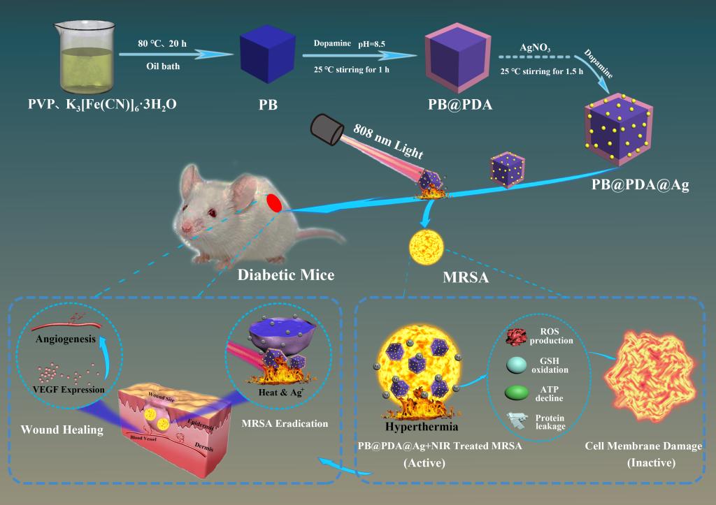 刘斌副教授课题组针对纳米银材料的团聚和抗菌效能问题,创造性的将银纳米粒子镶嵌在具有良好光热性能的普鲁士蓝纳米复合物表面,构建了一种双模式纳米抗菌复合物,结合近红外光激光照射技术,有效地促进了糖尿病小鼠多药耐药菌感染伤口的快速愈合。体外研究显示:这种联合抗菌策略通过破坏细胞完整性、产生ROS、降低ATP、氧化GSH等途径发挥抗多药耐药菌MRSA作用;体内实验表明:该策略通过减轻局部炎症反应和诱导创面血管内皮生长因子表达来促进MRSA感染的糖尿病创面愈合。研究结果以论文形式发表在生物材料Top期刊Biomaterials(10.1016/j.biomaterials.2020.119936),并已同步申请专利(CN201911347212.6),为后续产品研发奠定了坚实的基础。论文第一单位为黄色导航
