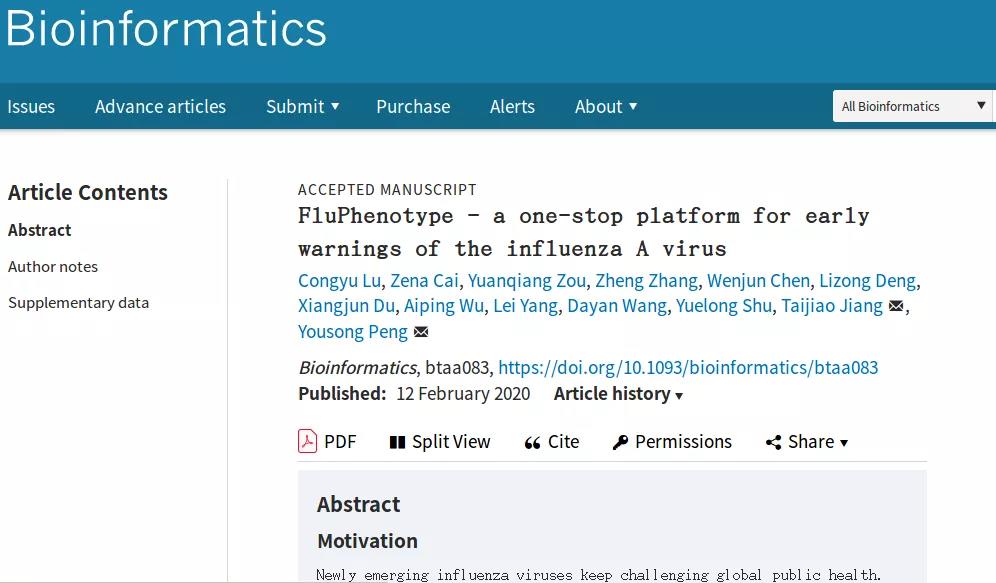 联合苏州系统医学研究所、中国国家流感中心和中山大学等单位,成功开发基于分子标记物的流感病毒表型预测平台FluPhenotype,并在国际生物信息学专业权威期刊《Bioinformatics》发表题为“FluPhenotype-a one-stop platform for early warnings of the influenza A virus"的文章进行相关介绍。该文章的第一作者为黄色导航