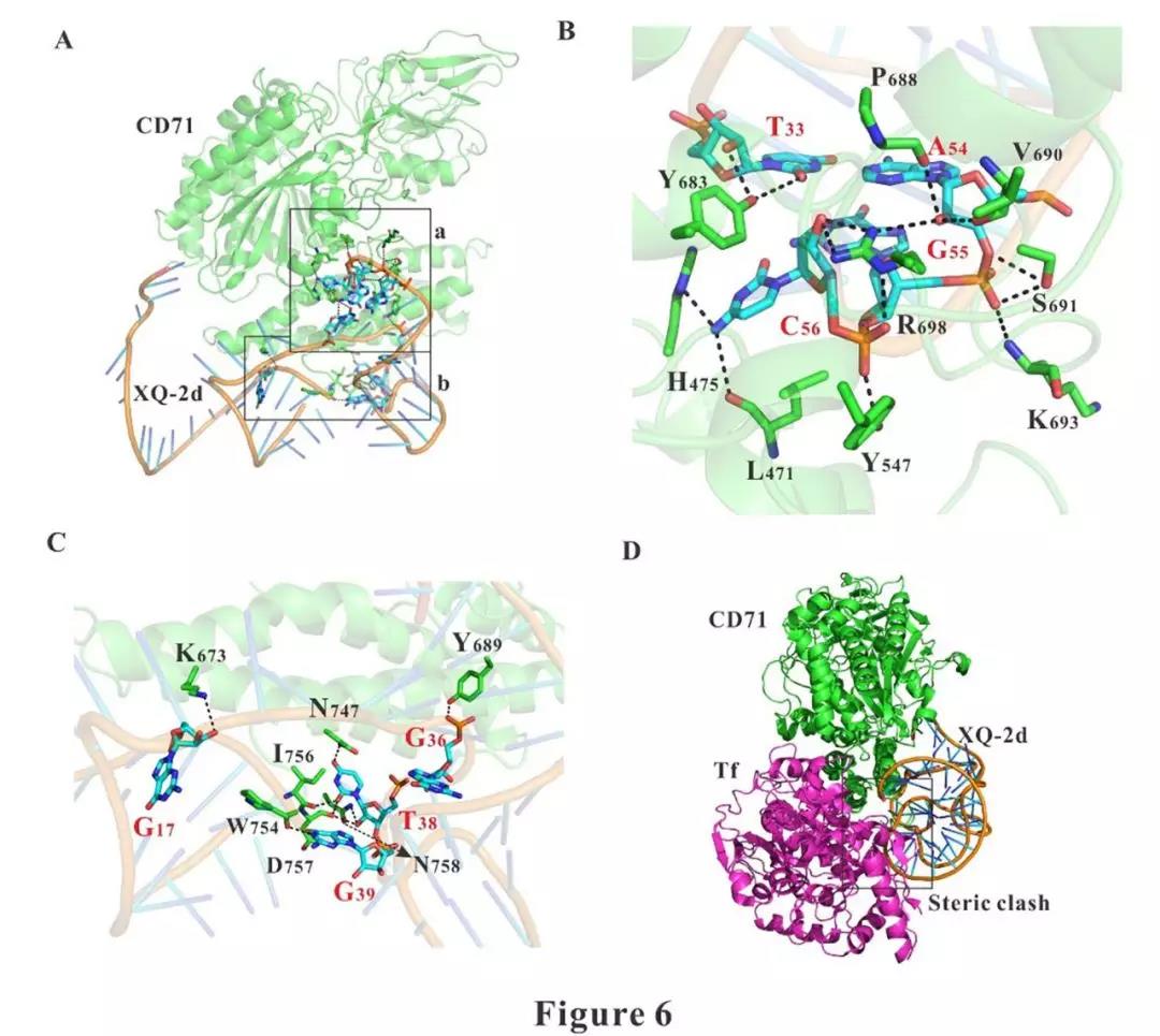研究发现,转铁蛋白受体1(transferrinreceptor1,TfR1, CD71)是核酸适体XQ-2d识别胰腺癌细胞的分子靶标。核酸适体XQ-2d与CD71的天然配体转铁蛋白(Transferrin,Tf)而不是抗CD71的抗体竞争性结合CD71的胞外区。通过构建Surface energy transfer(SET)nanoruler,成功地在活细胞表面测得XQ-2d与抗体之间在CD71上结合位点的距离大概为15nM。通过计算生物学分析CD71和XQ-2d的结构,并进行模拟分子对接,发现CD71上有16个关键氨基酸残基介导了与XQ-2d的结合,而这些氨基酸残基也是CD71天然配体转铁蛋白的结合位点,空间结构上的位阻解释了XQ-2d与转铁蛋白竞争性结合的分子基础。