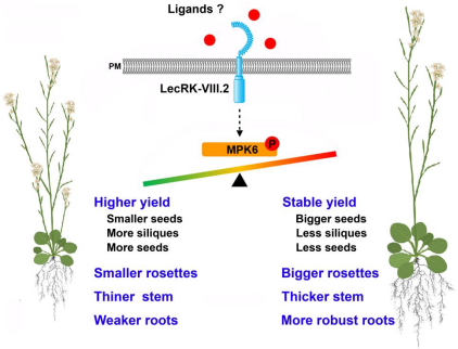 郭新红课题组题为“Lectin receptor-like kinase LecRK-VIII.2 is a missing link in MAPK signaling-mediated yield control”的研究论文,揭示了拟南芥凝集素类受体激酶LecRK-VIII.2作用于MAPK信号转导途径上游,参与调控包括角果数量、种子大小和数量在内的产量相关性状,并通过协调源库关系,促进根、茎、叶的生长,在作物改良方面具有重要的潜在利用价值。