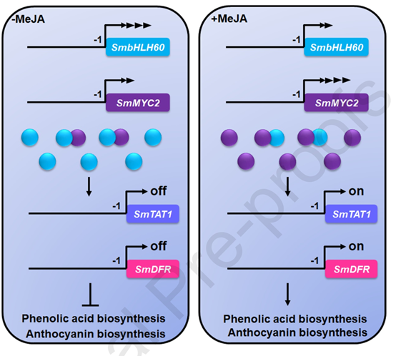综上所述,该研究发现了一种新型转录因子 SmbHLH60通过转录抑制SmTAT1和SmDFR负调控丹参中酚酸和花青素的生物合成。此外,SmbHLH60还通过与SmMYC2形成异二聚体的方式拮抗调节丹参次级代谢物质合成。该研究结果为MeJA介导的丹参次生代谢物生物合成调控的分子机制提供了新的见解。