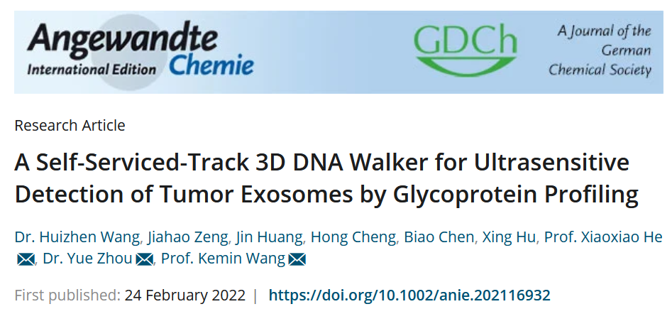王柯敏/何晓晓团队和湖南省肿瘤医院等单位合作,报道了一种基于轨道自助型三维DNA步行器的肿瘤外泌体糖蛋白分析与超灵敏检测方法,相关研究成果以“A Self-Serviced-Track 3D DNA Walker for Ultrasensitive Detection of Tumor Exosomes by Glycoprotein Profiling”为题发表在国际化学领域权威期刊《德国应用化学》(Angewandte Chemie International Edition)上。黄色导航
