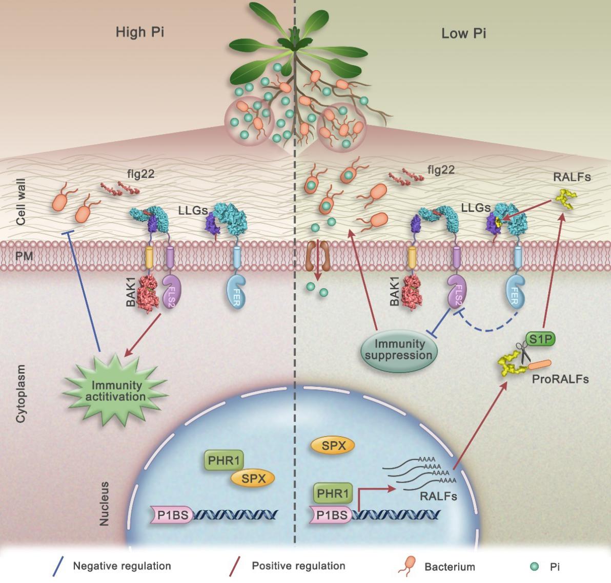 此项研究中,研究人员发现在拟南芥中,磷饥饿响应的主要转录调节因子PHR1直接与数个快速碱化因子(RALFs)基因的启动子结合,并在磷饥饿条件下激活它们的表达,RALFs通过抑制病原体相关分子模式(PAMP)触发的免疫(PTI)受体复合物的形成来抑制植物免疫,FERONIA是RALFs的受体蛋白,课题组前期研究表明FERONIA突变可增加植物对某些有害微生物的抵抗力,有意思的是,磷饥饿响应条件下PHR1-RALF-FERONIA信号通路介导的免疫抑制导致了一个特殊的根系微生物菌群,这个微生物菌群可以通过上调磷饥饿响应相关基因的表达来缓解磷饥饿。该研究工作填补了围绕PHR1介导的植物免疫反应变化的知识空白,为植物如何协调营养胁迫和免疫提供了模型。尤其重要的是,该分子机理在水稻和大豆等多个作物中保守存在,为利用FERONIA基因资源,提高作物磷吸收提供了改良路径。