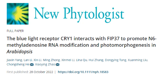 赵小英/何崇圣团队在国际权威期刊New Phytologist(IF=10.323)在线发表了题为“The blue light receptor CRY1 interacts with FIP37 to promoteN6-methyladenosine RNA modificationand photomorphogenesis inArabidopsis”的研究论文。该研究报道了拟南芥蓝光受体CRY1与m6A甲基转移酶复合体成员FIP37互作,促进m6A修饰和光形态建成的新机制。