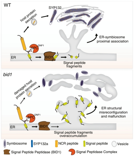 以上结果表明,BID1是根瘤细胞中内质网-共生体信号传递途径的关键元件,通过调控内质网上残留信号肽片段的清除控制内质网的功能和形态结构,从而控制宿主调控蛋白向共生体的定向运输。