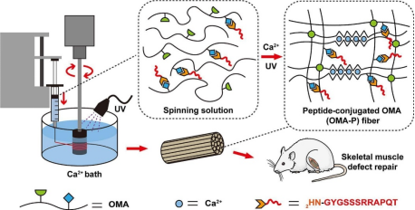 生物聚合物纤维因其通过有序微观结构促进组织再生的能力,在骨骼肌损伤修复中受到了广泛关注。海藻酸(Alg)是一种天然多糖,因其良好的生物相容性和可降解性而被广泛应用于生物医学领域,其通常通过离子相互作用制备湿纺纤维。然而,离子交联的Alg纤维在生理条件下快速降解且缺乏生物活性分子的结合位点,限制了其在组织再生中的应用。研究团队合成了氧化甲基丙烯酸海藻酸钠(OMA)衍生物,制备了由Ca2+离子和光引发共价键双重交联的Alg纤维。此外,氧化链上引入的醛基通过希夫碱反应促进了生物活性分子的共价结合。将胰岛素样生长因子-1的C域肽(IGF-1C)结合到纤维上获得多肽结合纤维(OMA-P),并评价了该纤维促肌肉再生功能。