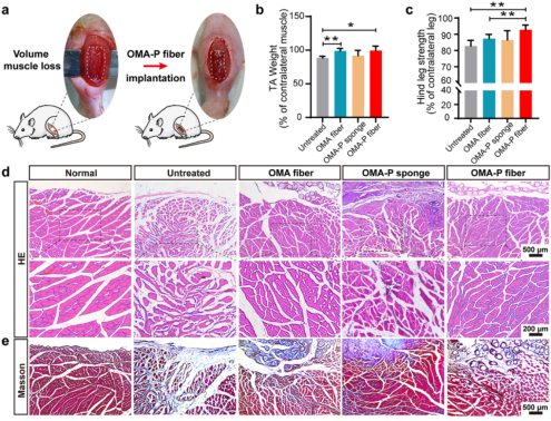 细胞实验表明,OMA-P纤维促进了C2C12成肌细胞的增殖并引导其定向生长。在大鼠体积性肌肉损失(VML)模型中,由于轴向引导和生物活性肽结合的双重作用,OMA-P纤维相较于无肽的OMA纤维和无序结构的OMA-P海绵显著改善了肌肉再生。