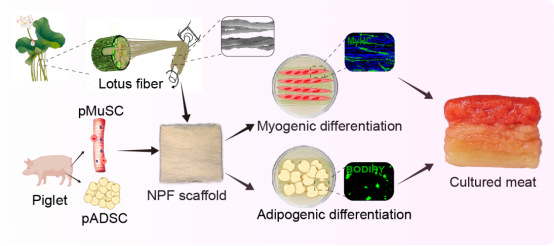 的张璨/戴建武科研团队取得重大突破,创新性地利用天然藕丝作为细胞培养支架,成功培育出具有天然肌肉纹理和真实口感的细胞培养肉,让"植物为骨,细胞为肉"的现代神话照进现实!近日,该团队在生物医学领域Top期刊《Bioactive Materials》(中科院一区,IF=20.5)发表了题为“Lotus fiber-derived scaffolds for enhanced cultured meat production: Quality and sustainability”的研究论文。这项技术不仅为人造肉生产提供了更环保、更经济的解决方案,也为传统神话赋予了现代科技内涵。